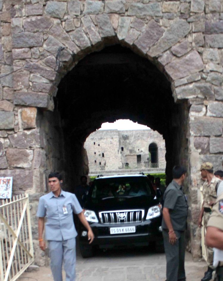 Chief Minister K Chanderasekar Rao inspecting Rani Mahel area of Golconda fort for hoisting national flag along with GHMC Mayor Majeed Hussain, Carvan MLA Kauser, Chief Secratry and DGP departting from the decades-old tradition of celebrating the I Day at Parade Grounds in Secunderabad.