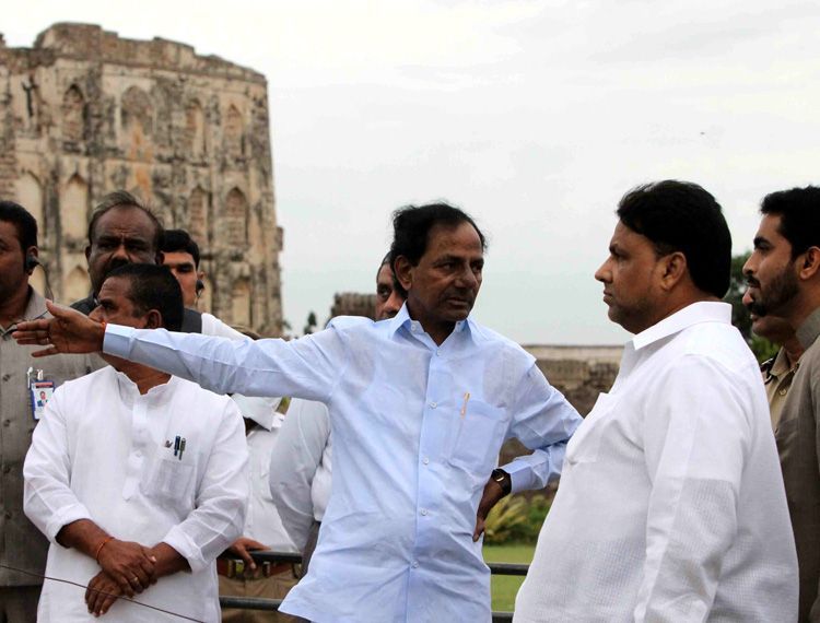 Chief Minister K Chanderasekar Rao inspecting Rani Mahel area of Golconda fort for hoisting national flag along with GHMC Mayor Majeed Hussain, Carvan MLA Kauser, Chief Secratry and DGP departting from the decades-old tradition of celebrating the I Day at Parade Grounds in Secunderabad.
