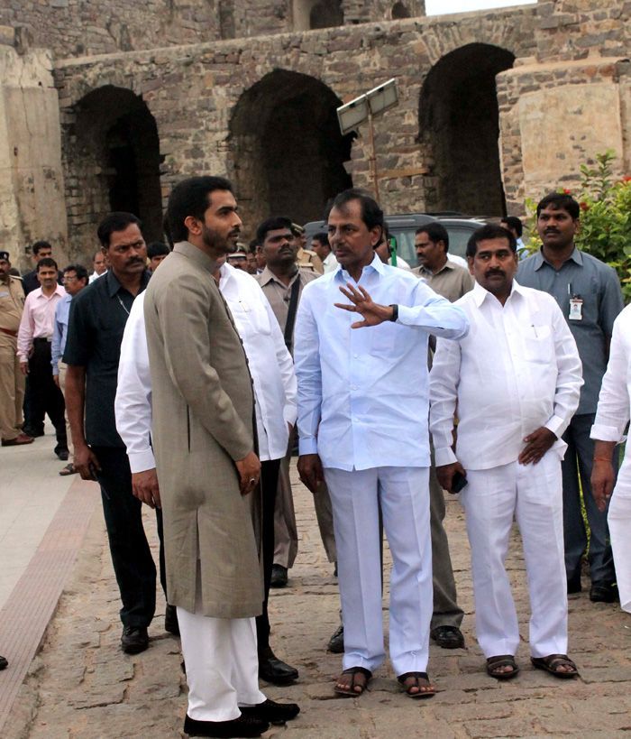 Chief Minister K Chanderasekar Rao inspecting Rani Mahel area of Golconda fort for hoisting national flag along with GHMC Mayor Majeed Hussain, Carvan MLA Kauser, Chief Secratry and DGP departting from the decades-old tradition of celebrating the I Day at Parade Grounds in Secunderabad.