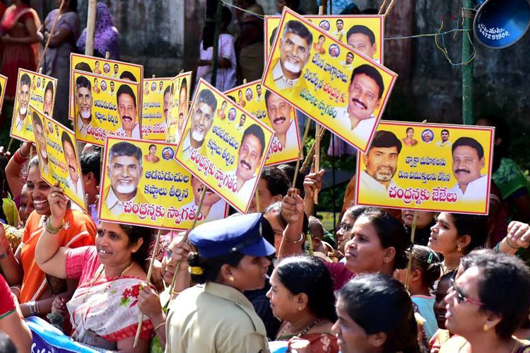 Women gathered outside the venue of Collectors' conference to greet chief minister Chandrababu Naidu in Vijayawada on Thursday.