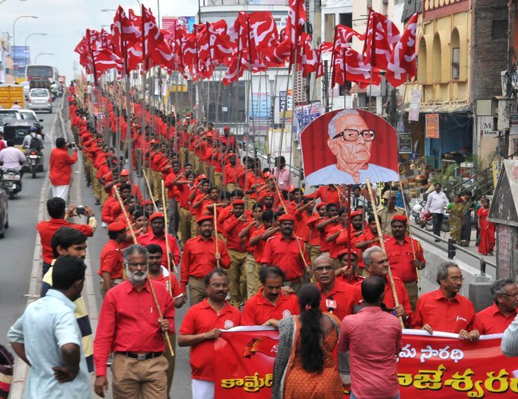 A massive rally held by activists of CPI in Hyderabad on Monday to commemorate the centenary celebrations of comrade Chandra Rajeswara Rao. CPI and CPM national leaders Suravaram Sudhakara Reddy, Prakash Karat addressed the gathering at Nizam College.