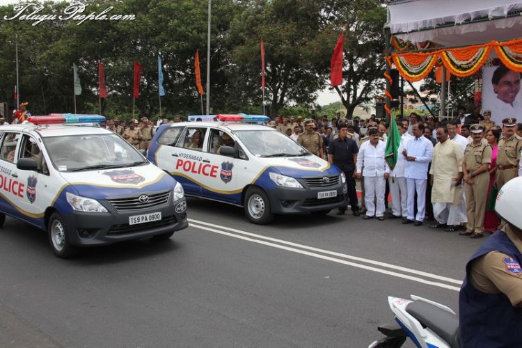 Telangana Chief Minister K Chandrasekhara Rao flags off Innova cars and motorcycles procured for city police at Tank Bund in Hyderabad on Thursday.