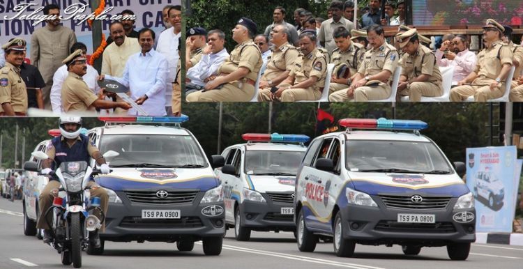 Telangana Chief Minister K Chandrasekhara Rao flags off Innova cars and motorcycles procured for city police at Tank Bund in Hyderabad on Thursday.