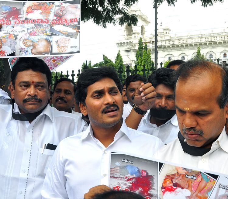 Leader of Opposition, YSRCP president YS Jaganmohan Reddy along with his party legislators stages a protest demo outside the AP Assembly on Saturday.