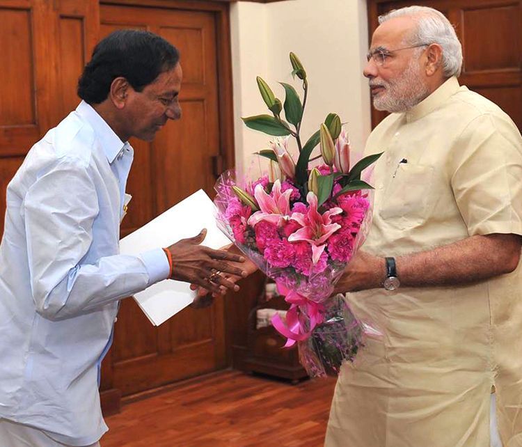Chief Minister of Telangana K. Chandrasekhar Rao offering a bouquet of flowers to Prime Minister Narendra Modi in New Delhi on Saturday.