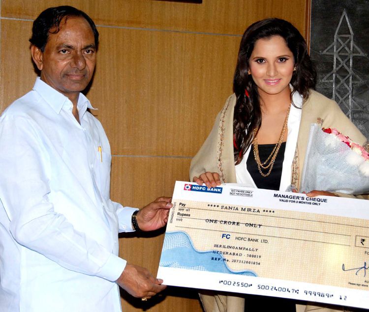 Chief Minister K Chandrasekhar Rao presenting a cheque worth Rs 1 crore to the brand ambassador of Telangana and Tennis star Sania Mirza in Hyderabad on Thursday.