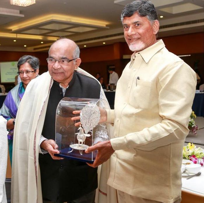 Chief Minister of Andhra Pradesh N Chandrababu Naidu felicitating chairman of 14th Finance Commission Dr YV Reddy before commencement of its meeting at Tirupati on Friday.