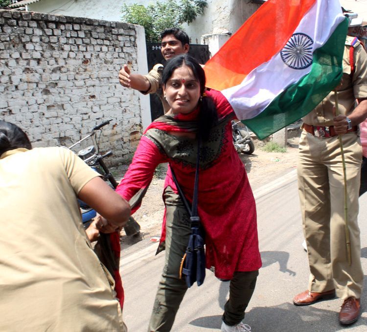 Police cane charged BJP activists as hundreds of them tried to force their way in to Golkonda Fort on Wednesday to hoist national flag to mark Hyderabad Liberation Day. Police constables foil a woman activist from entering the fort premises.