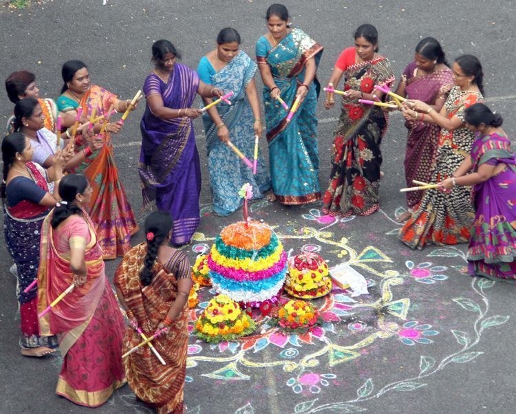 Telangana state government women employees playing Bathukamma in front of Council building here in Hyderabad on Monday.