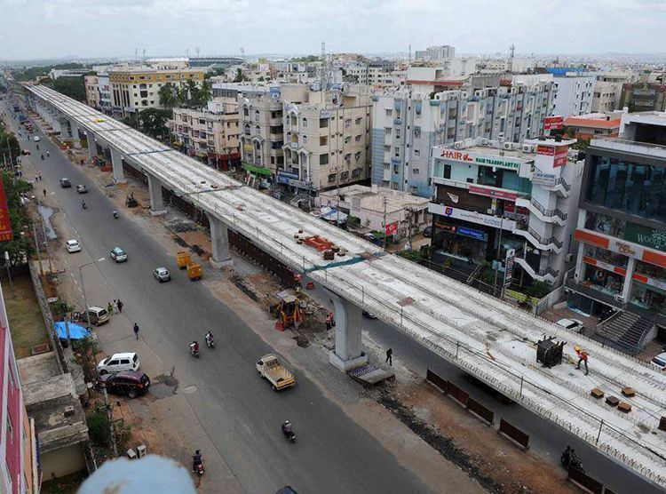 A view of the long stretch of Hyderabad Metro Rail project works in progress between Miyapur and Ameerpet.