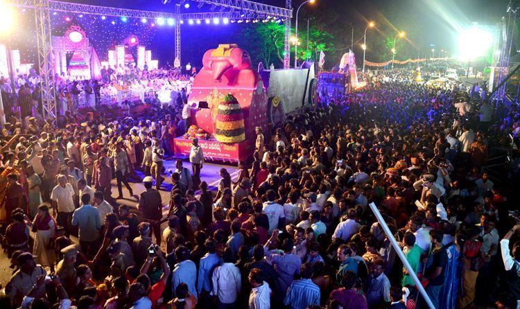 Scores of women carrying the Bathukammas in a procession from LB Stadium to the Tank Bund.