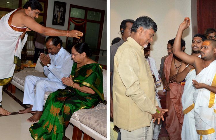 Divine blessing: Two different pictures of chief ministers Andhra Pradesh and Telangana: While N Chandrababu Naidu is being blessed by priests after performing puja at his new chambers in AP Secratraite, KCR and his wife gets the blessings of priests after Vijayadasami at his camp office in Hyderabad on Friday.