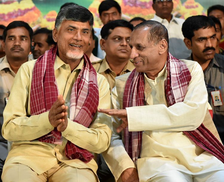 Chief Ministers of Andhra Pradesh and Telangana N Chandrababu Naidu, K Chandrasekhar Rao meets and greets each other at Alai Balai (Dasara Milan) hosted by BJP MP Bandaru Dattatreya at Jal Vihar in Hyderabad on Sunday. Governor ESL Narasimhan, Union minister M Venkaiah Naidu along with leaders of all parties attended the programme.