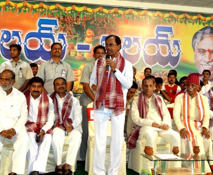 Chief Ministers of Andhra Pradesh and Telangana N Chandrababu Naidu, K Chandrasekhar Rao meets and greets each other at Alai Balai (Dasara Milan) hosted by BJP MP Bandaru Dattatreya at Jal Vihar in Hyderabad on Sunday. Governor ESL Narasimhan, Union minister M Venkaiah Naidu along with leaders of all parties attended the programme.