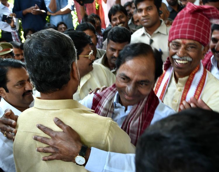 Chief Ministers of Andhra Pradesh and Telangana N Chandrababu Naidu, K Chandrasekhar Rao meets and greets each other at Alai Balai (Dasara Milan) hosted by BJP MP Bandaru Dattatreya at Jal Vihar in Hyderabad on Sunday. Governor ESL Narasimhan, Union minister M Venkaiah Naidu along with leaders of all parties attended the programme.