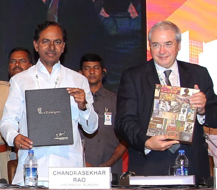 Chief Minister of Telangana K Chandrasekhar Rao releasing a souvenir of World Metropolis Congress which began at Hitex convention center in Hyderabad on Tuesday.