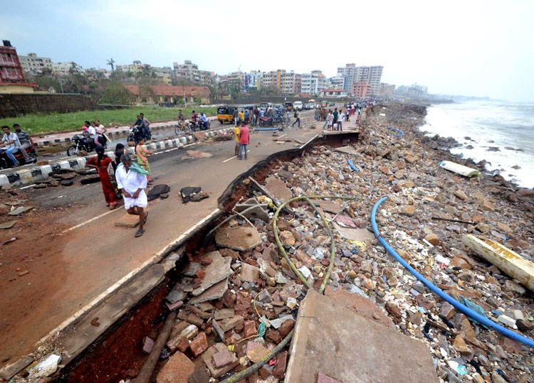 The Trial of Disaster: Visakhapatnam resembled a war zone, a day after the very severe cyclonic storm, Hudhud, blasted the city. With uprooted trees and electric poles lying everywhere in the streets and power cables dangling dangerously on the roads, shops and even buildings, the city, as many citizens bemoaned, was literally torn apart. – More Photos Inside.