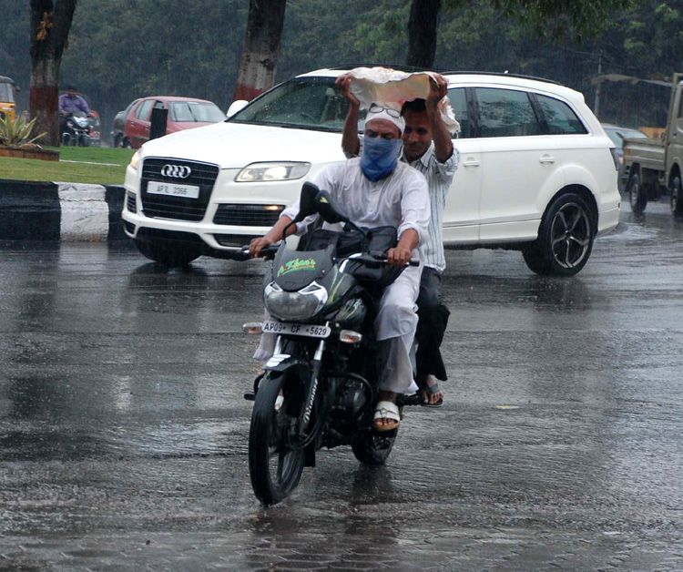 A pillion rider struggles hard to keep himself and the rider from drenching under the incessant drizzles lashing Hyderabad since two days on Sunday.