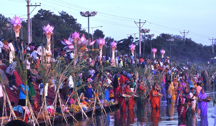 Jain women offering prayers to Sun God at Hussain Sagar lake in Hyderabad on Wednesday on the eve of Chhath festival.
