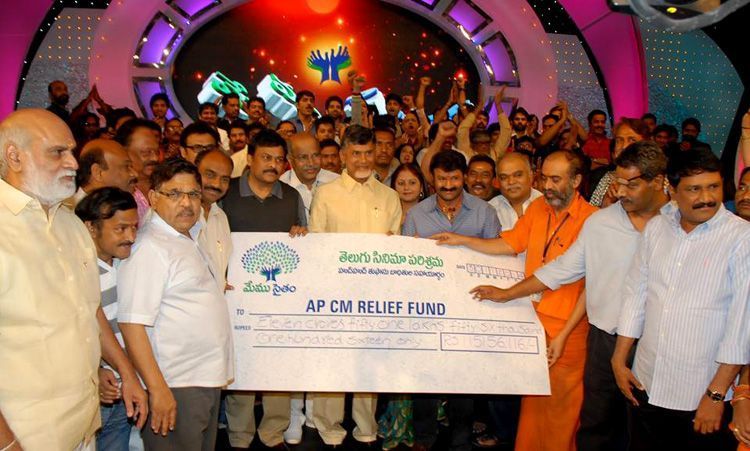 Andhra Pradesh chief minister N Chandrababu Naidu had a gala time with film celebrities who came together under one roof for a common cause. The Memu Saitham event held at Annapurna Studios by the men and women of film industry to raise funds for the relief of HudHud cyclone affected people has been a grand success. Mega Star Chiranjeevi, Chandrababu Naidus bonhomie at the event draws everyone’s attention.