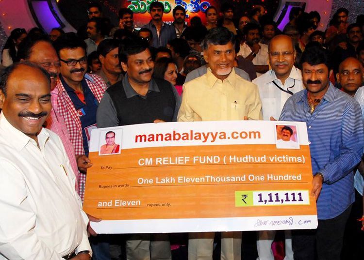 Andhra Pradesh chief minister N Chandrababu Naidu had a gala time with film celebrities who came together under one roof for a common cause. The Memu Saitham event held at Annapurna Studios by the men and women of film industry to raise funds for the relief of HudHud cyclone affected people has been a grand success. Mega Star Chiranjeevi, Chandrababu Naidus bonhomie at the event draws everyone’s attention.