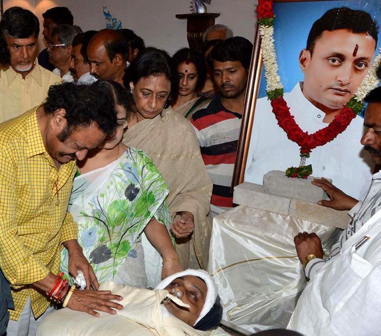 Nandamuri Harikrishna breaks down looking at the mortal remains of his son Janakiram who was killed in a ghastly road accident on Saturday in Nalgonda dist. Janakiram's body was kept at his residence to enable people to pay their last respects in Abids, Hyderabad before final rituals are performed.