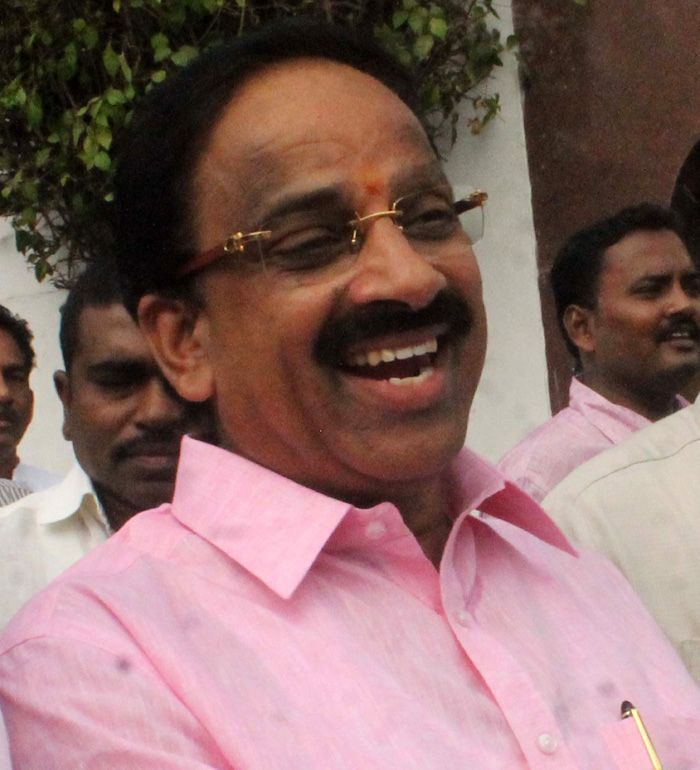 Newly inducted Minister Tummala Nageswara Rao greets his followers after being sworn in as minister in KCR cabinet at a ceremony held in Raj Bhavan on Tuesday.