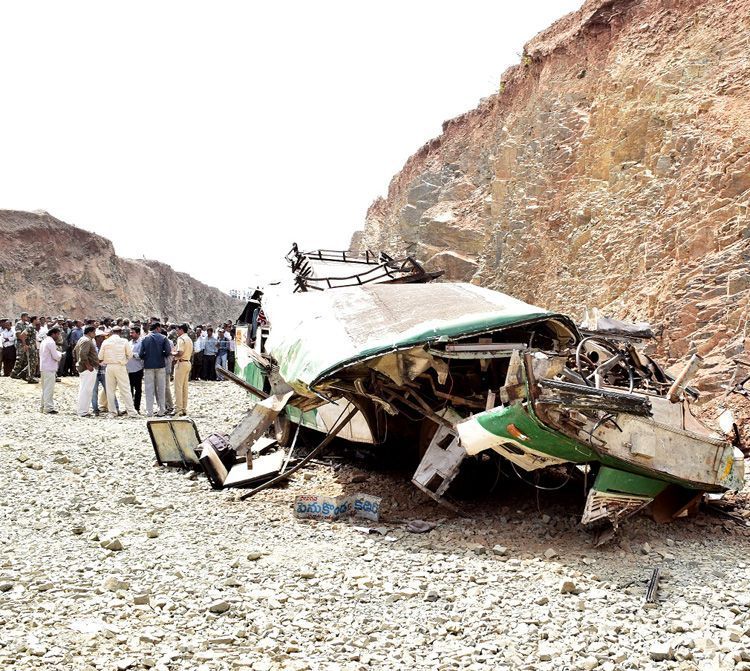 20 passengers were killed and 30 others injured when an RTC bus in which they were travelling fell into a deep gorge between Penukonda-Madakasira in Anantapur district on Wednesday. Of the injured the condition of eight students is reported to be critical. The injured have been admitted to hospitals in Penukonda, Bangaluru, Hindupur, Anantapur hospitals. – Click here for more photos inside.
