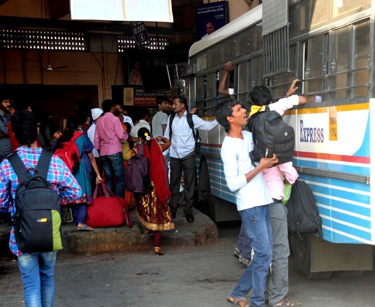 As schools and colleges have declared Sankranti holidays, bus stands and railway stations in Hyderabad are packed with homeward people and passengers are finding it difficult to find space in the compartments and buses. A scene at Imliban bus station shows the passengers rush.