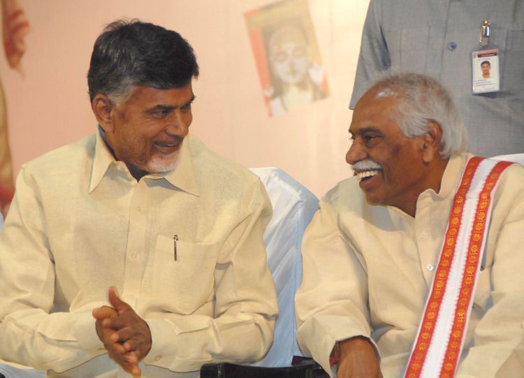 Chief Minister of Andhra Pradesh N Chandrababu Naidu sharing a joke with Union Minister Bandaru Dattatreya at a book launch programme in Hyderabad on Saturday.