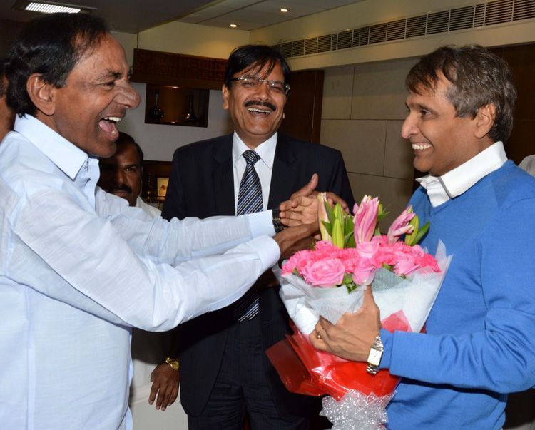 Telangana chief minister K Chandrasekhar Rao extends a cheerful welcome to Union Railways minister Suresh Prabhu when the latter called on CM at his camp office on Monday.