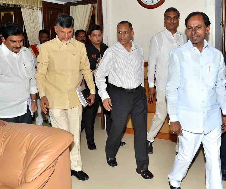 Chief Minister of AP N Chandrababu Naidu, Chief Minister of Telangana, K Chandrasekhar Rao, met Governor E S L Narasimhan at Rajbhavan on Saturday to discuss and resolve the raging controversy over sharing of Nagarjuna Sagar waters. Both the CMs have decided to resolve issues between the two states through dialogue.
