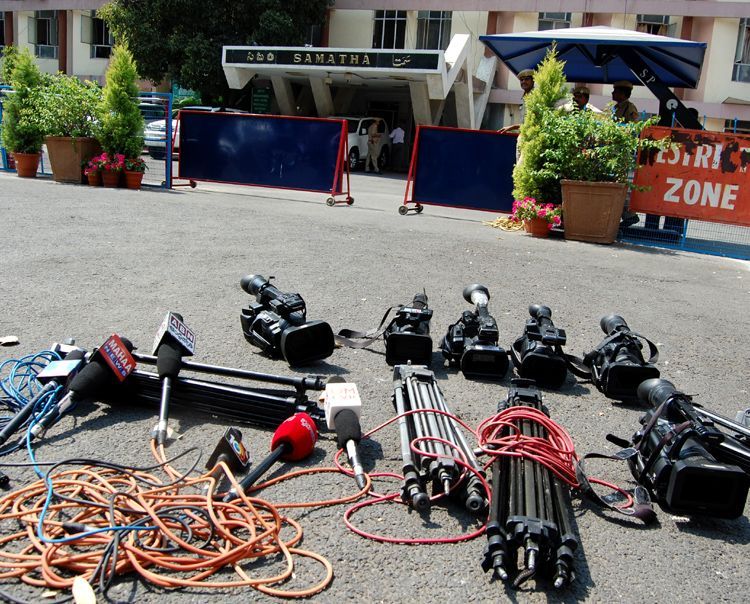 Journalist of print and electronic media staging a protest in front of Samatha block which houses Telangana Chief Ministers office in Secretariat on Friday in protest against governments plans to ban the entry of media in Secretariat premises.