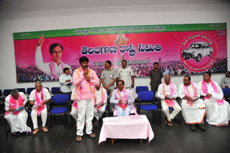 TRS Supremo Sri K. Chandrasekhar Rao addressing with TRS party cadre in Telangana Bhavan on Monday.