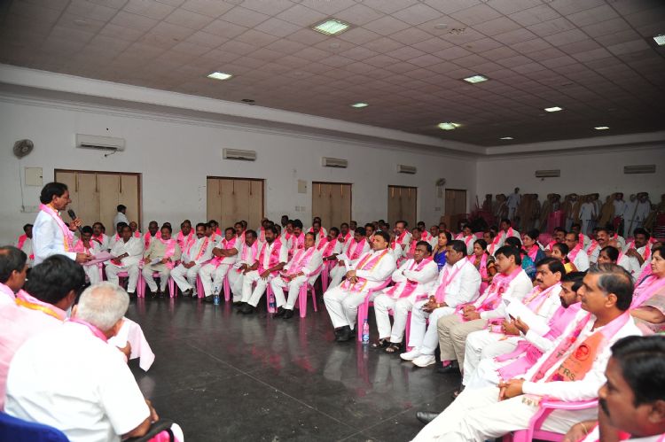 TRS Supremo Sri K. Chandrasekhar Rao addressing with TRS party cadre in Telangana Bhavan on Monday.