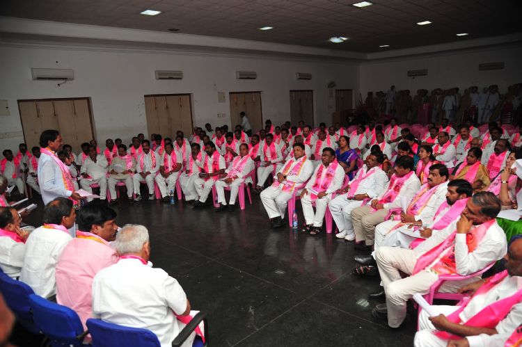 TRS Supremo Sri K. Chandrasekhar Rao addressing with TRS party cadre in Telangana Bhavan on Monday.
