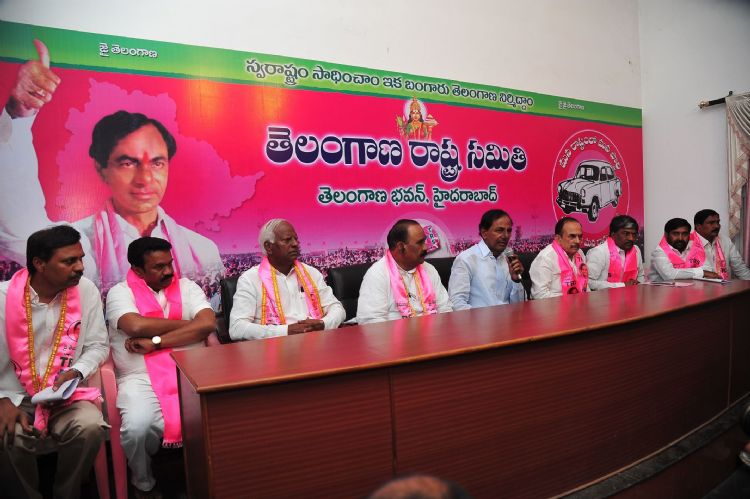 TRS Supremo Sri K. Chandrasekhar Rao addressing with TRS party cadre in Telangana Bhavan on Monday.