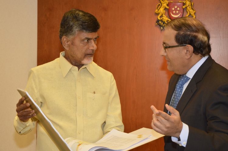 AP CM N. Chandrababu Naidu with Singapore Minister for Trade and Industry S. Iswaran in Singapore on Monday.