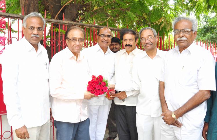 CPI Telangana and Andhra Pradesh State Leaders welcomming the newly elected CPI National General Secretary Suravaram Sudhakar Reddy at Makhdoom Bhavan in Hyderabad on tuesday