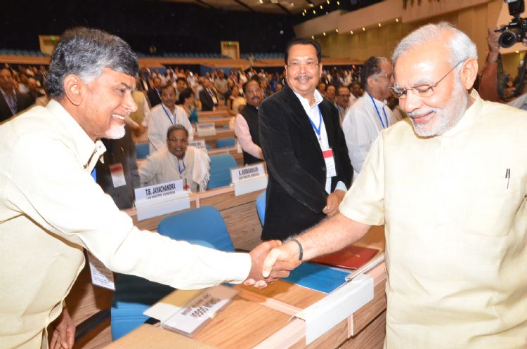 Chief Minister of Andhra Pradesh, Sri Nara Chandra Babu Naidu with Prime Minister Narendra Modi at the Joint Conference of Chief Ministers of the State and Chief Justices of the High Court held at New Delhi on 5th April, 2015.