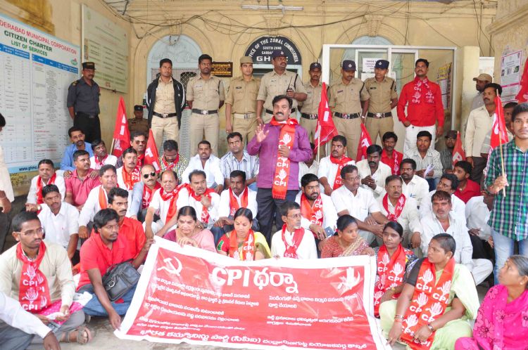 Activists of CPI led by CPI Telangana State Executive Member, GH South Zone Secretary E.T. Narasimha hold dharna in front of GHMC South Zone office, Charminar in HYderabad demanding to register murder case against Contractors and GHMC authorities.