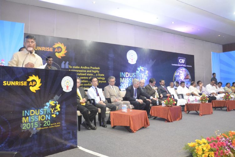 AP CM N. Chandrababunaidu addressing industrialists inconnection with inauguration of Industry Mission 2015 - 2020 in Visakhpatnam on 29th April 2015.