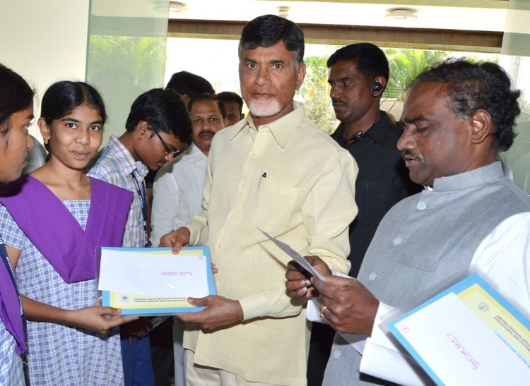 AP CM Chandrabau Naidu congratulating the students of APSWREIS on achieving top ranks in IPE and IIT - JEE Mains at his residence on 1st May 2015.