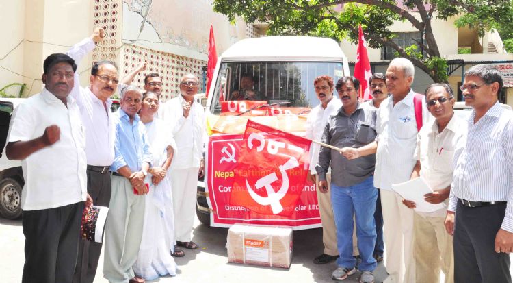 CPI National Secretary Dr. K. Narayana flag offed the van with relief material in the form of LED lights for Nepal earthquake victims at makhdoom bhavan in Hyderabad on sunday.