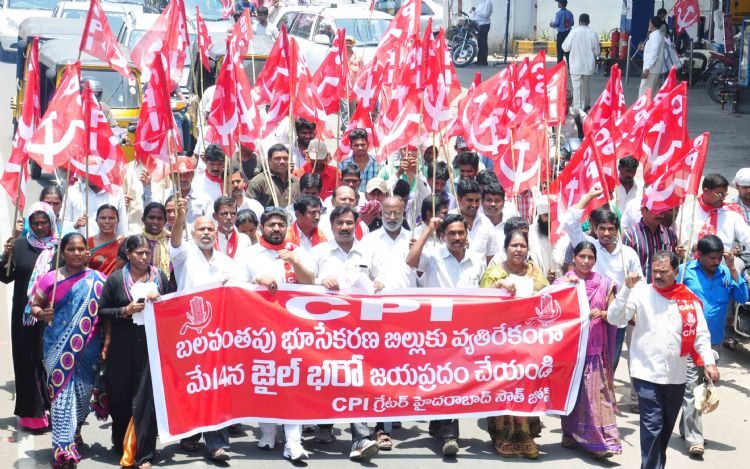 CPI activists led by CPI Telangana State Executive Member, SZ Secretary E.T. Narasimha hold rally appealing public to make succes CPI Jail Bharo programme demanding to roll back Central Government Land Aquistion Act at Himayat Nagar in Hyderabad on Thursday