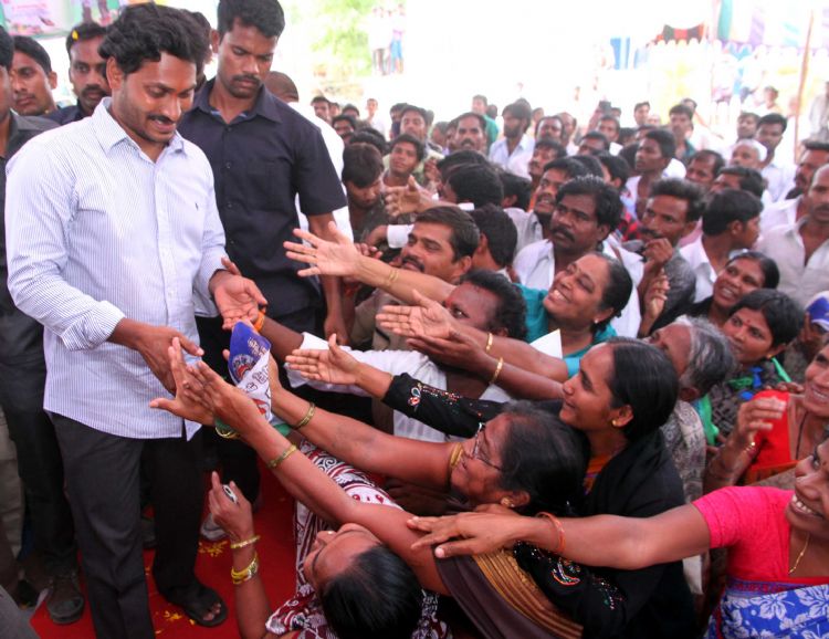 YSRCP President YS Jagan interacting with Dwakra Womens and farmers in Thimmapuram of Guntakal Constituency on Thursday.