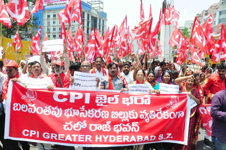 CPI Telangana State Secretary Chada Venkat Reddy, CPI National Executive Member Surawaram Vijayalaxmi and CPI Greater Hyderabad SZ Council Secretary E.T. Narasimha hold Chalo Raj bhavan Jail Bharo rally protesting against Central Government Land Aquisition Ordinance at Khairtabad x roads in Hyderabad on thursday and police arrested them.
