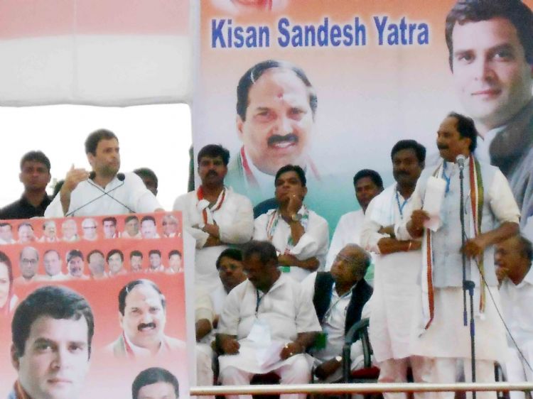 Addressing a public meeting at Wadial near Nirmal of Adilabad district at the conclusion of his 15 km long 'Kisan Sandesh Yatra' on May 15, 2015.