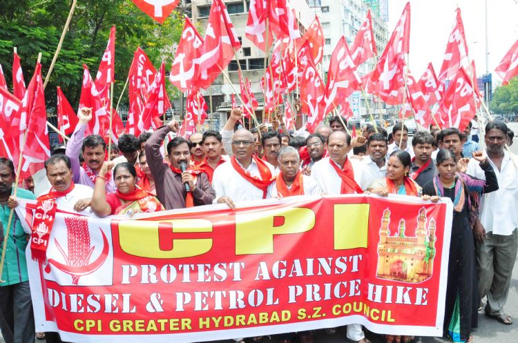 CPI Telangana State Secretary Chada Venkat Reddy, CPI State Executive Member V. Ramnarasimha Rao, CPI Greater Hyderabad SZ Council Secretary E.T. Narasimha with party workers hold big rally and burnt the effigy of Prime Minister Narendra Modi protesting against the hike on Pertol prices near Basheerbagh press club in Hyderabad on saturday.