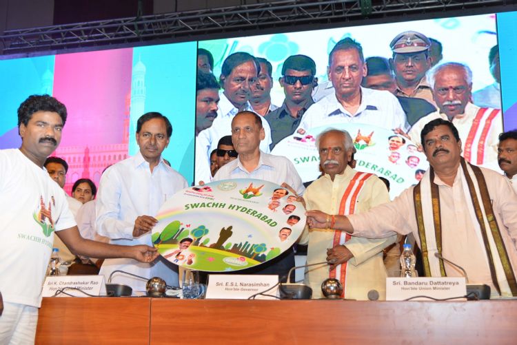 E S L Narasimhan, Governor and Telangana CM KCR Participated in Swachh Hyderabad Programme at HICC, Madhapur, Hyderabad on 16th May 2015.